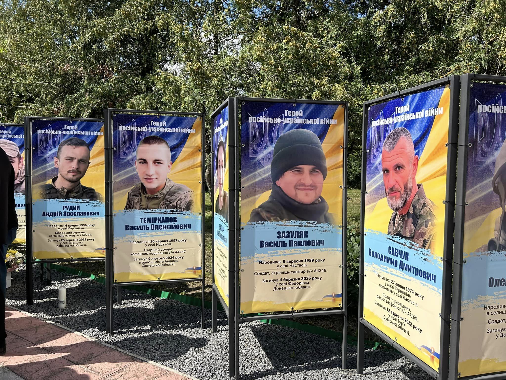 На металоконструкціях розміщені банери зі світлинами 34 військовослужбовців з Великоберезовицької громади, які загинули у російсько-українській війні.
